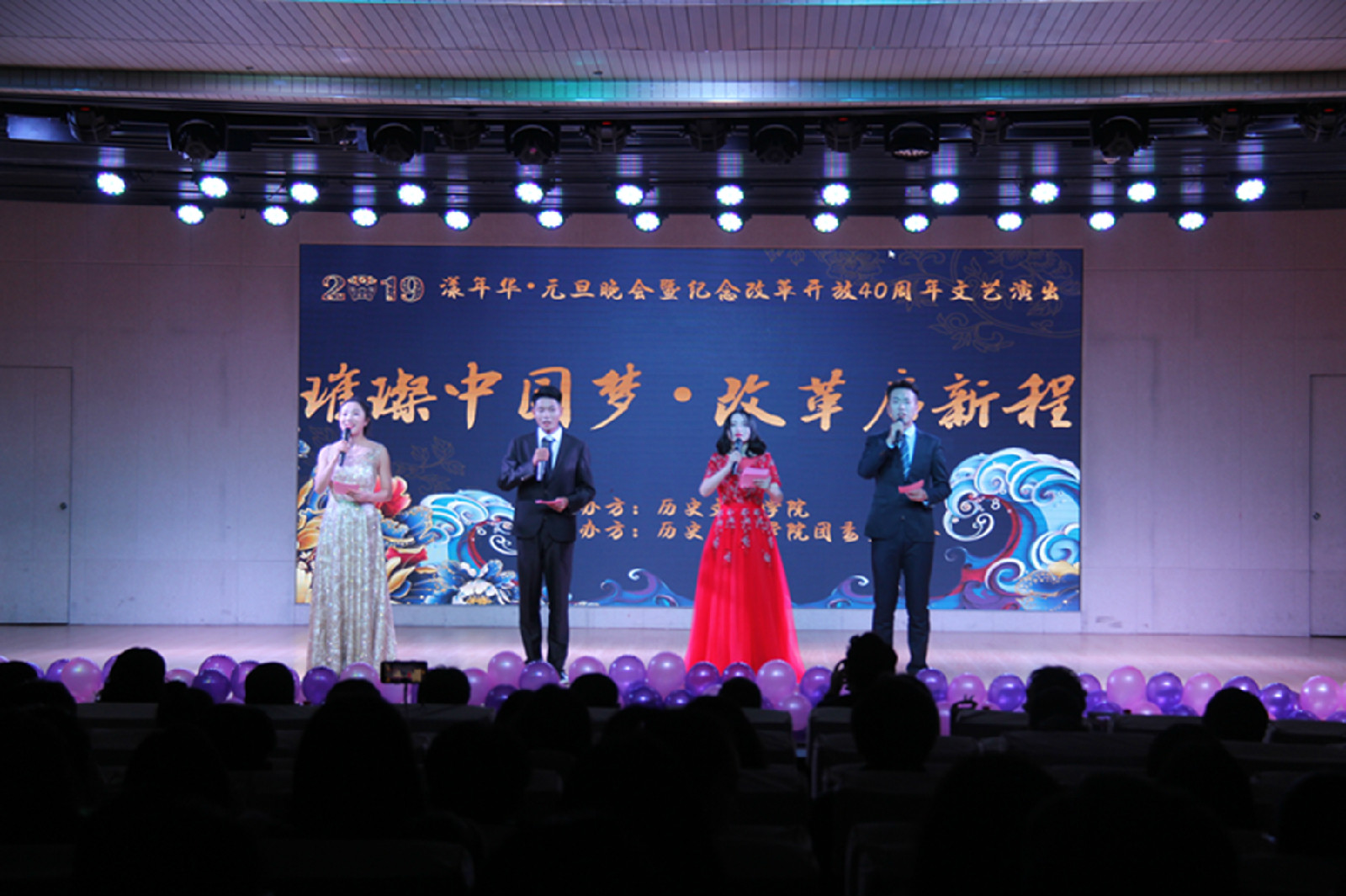 12月26日晚,公司“璀璨中国梦,改革启新程”2019年元旦晚会暨纪念改革开放四十周年文艺演出在校理科楼报告厅隆重举行。公司经理尹全海,副经理田青刚、叶宗宝、余纪珍,副书记刘喜元和金年会jinnianhuicom全体在校教师及四百余名员工共同观看了本次晚会。